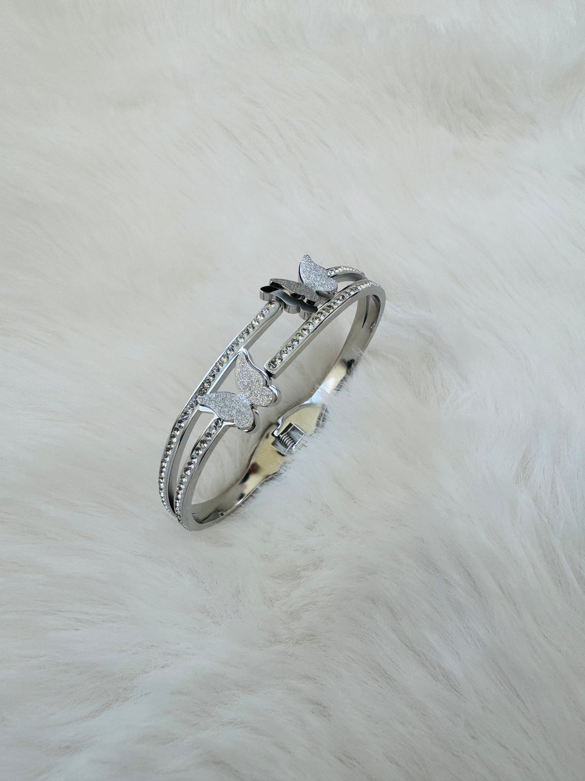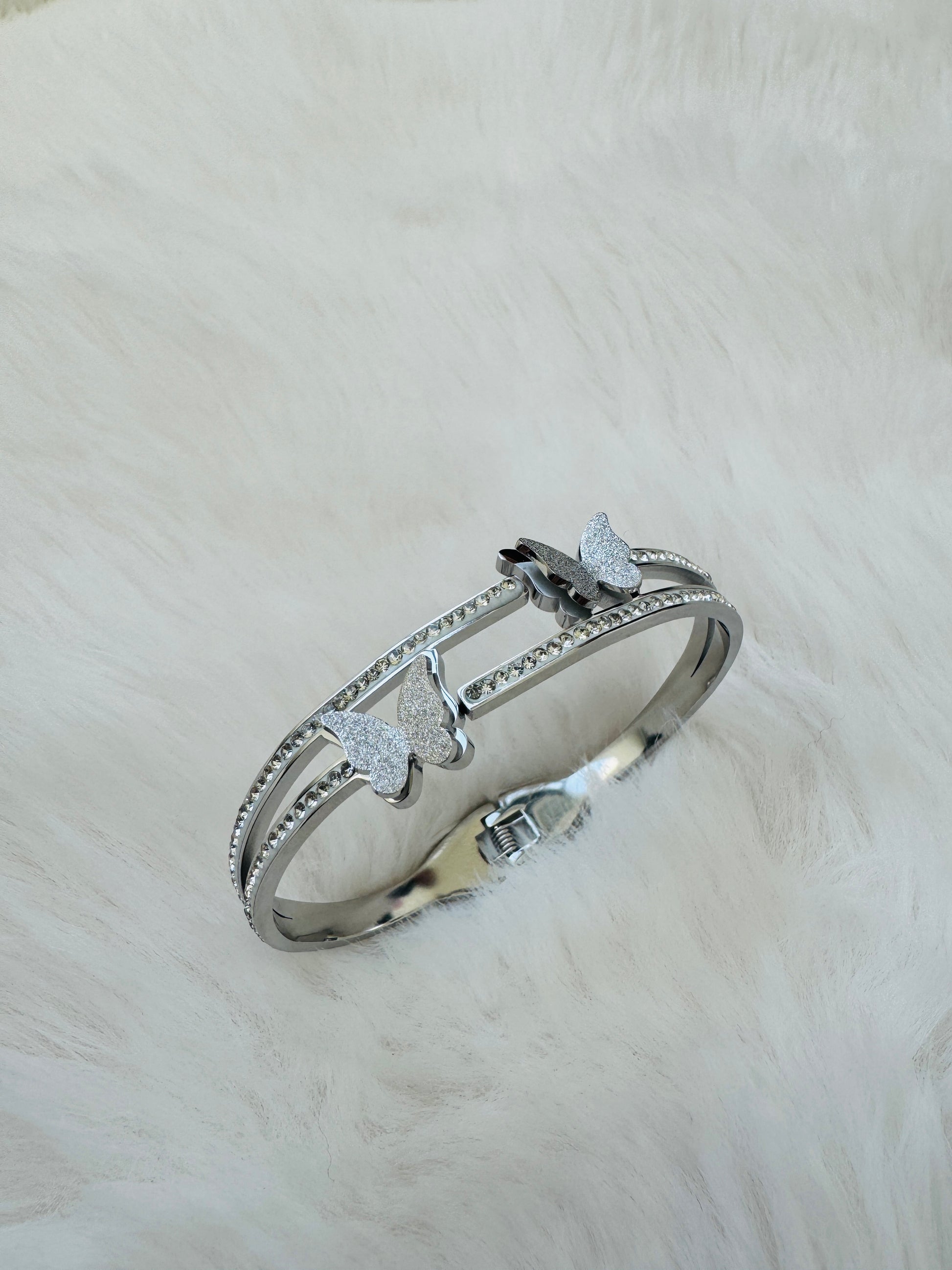 Graceful and radiant, this silver bangle features twin butterflies delicately perched between twin rows of shimmering stones. The polished silver finish and sparkly stones catch the light beautifully, adding a subtle sparkle to your wrist..Measurement: 6cmx5cm, Shape: Oval, silver plated,Anti Tarnish,waterproof and hypoallegenic