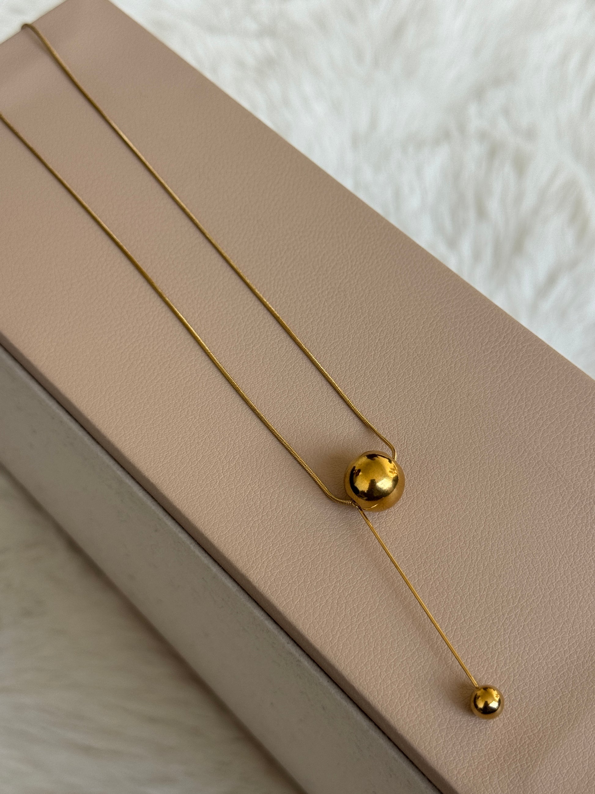 Effortlessly elegant, the Luxe Gold Necklace features a sleek, elongated pendant that swings gracefully like a golden pendulum. With its minimalist yet striking design, this necklace captures the essence of modern luxury, making it the perfect statement piece for any occasion.18k Gold plated Anti Tarnish,waterproof and hypoallegenic