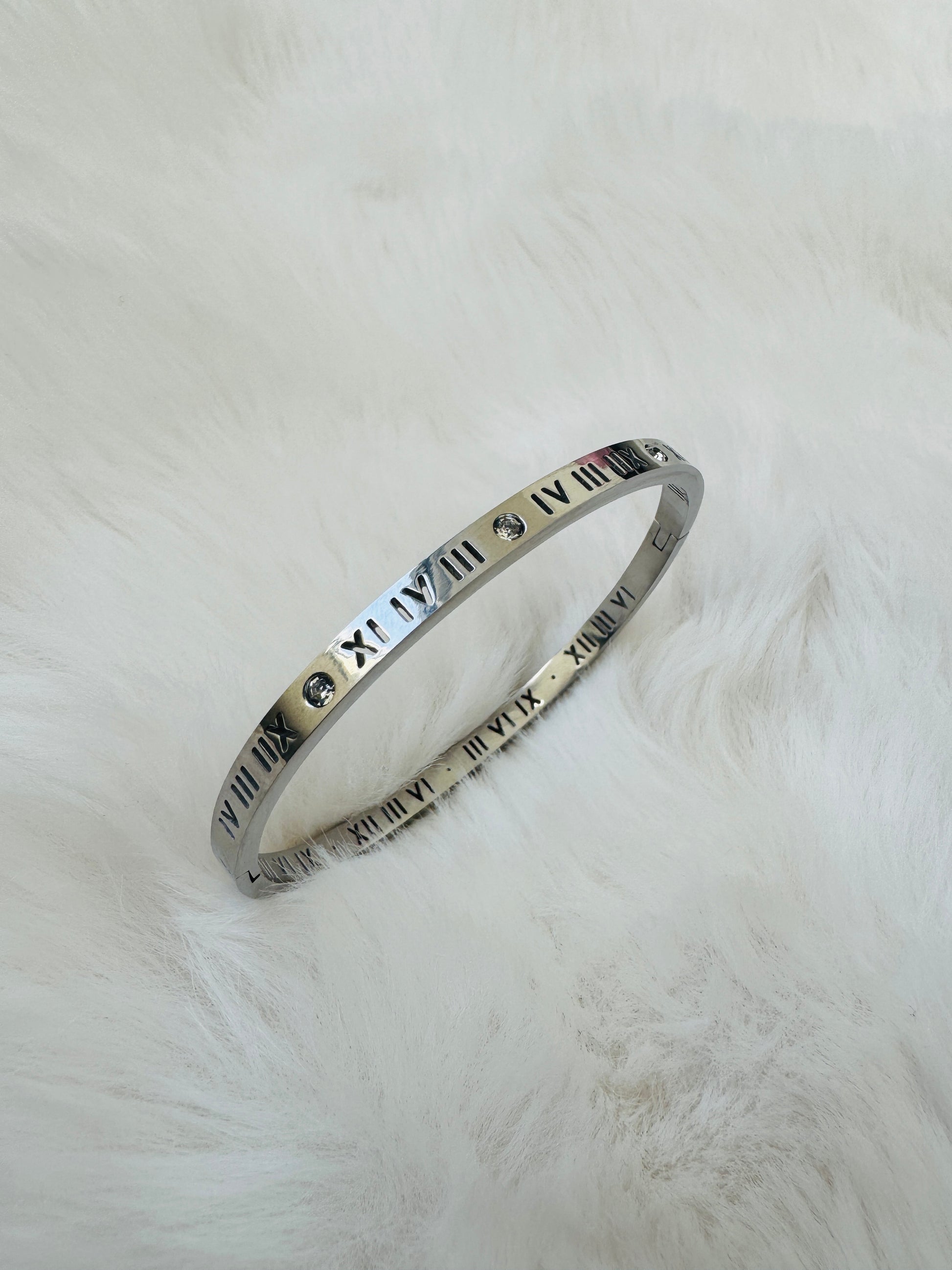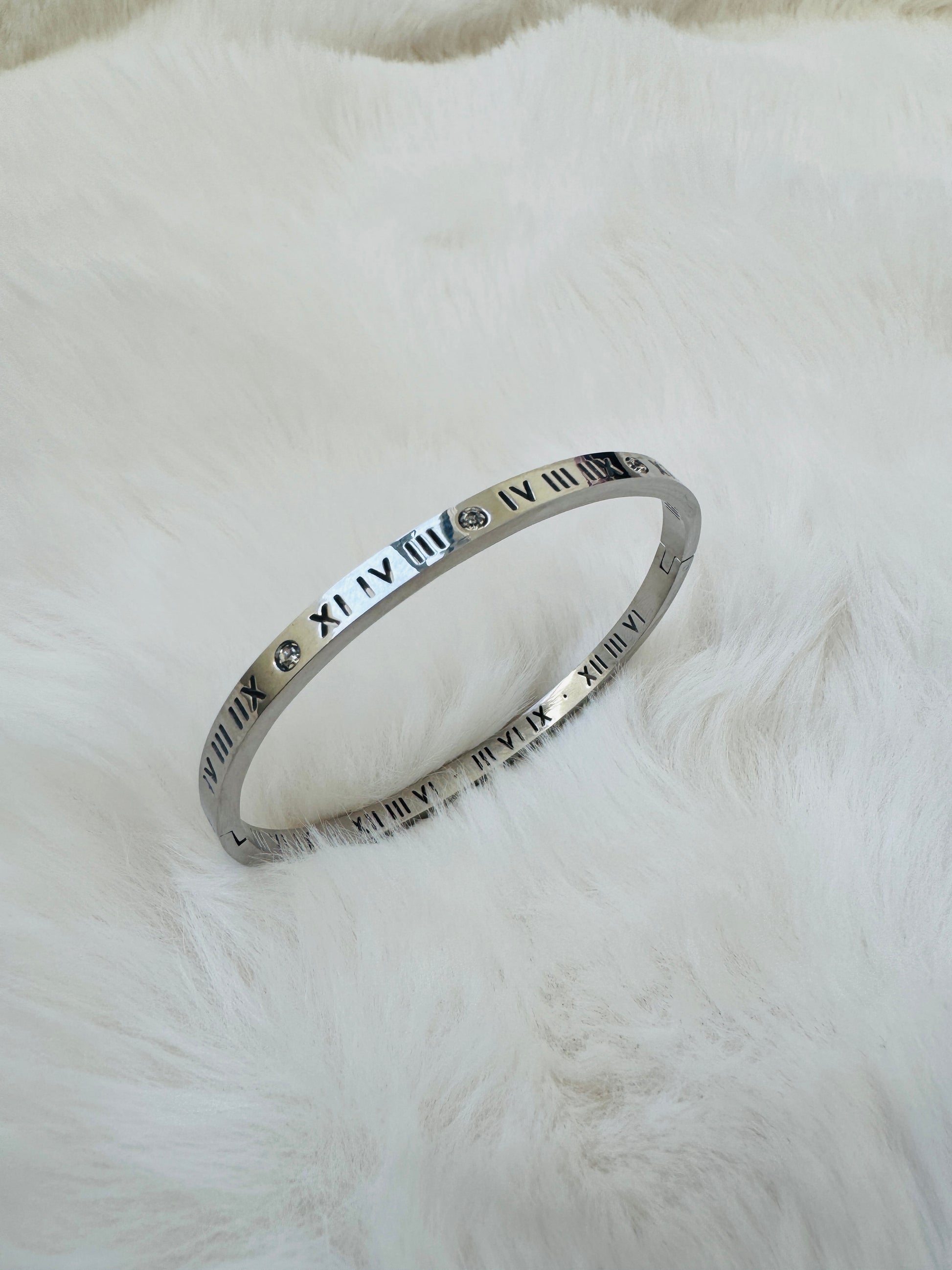 Classic elegance meets modern minimalism in this polished silver bangle engraved with timeless Roman numerals. Symbolizing everlasting moments and the beauty of time, its sleek design adds a sophisticated edge to any look.Measurement: 6cmx5cm, Shape: Oval,silver plated,Anti Tarnish,waterproof and hypoallegenic