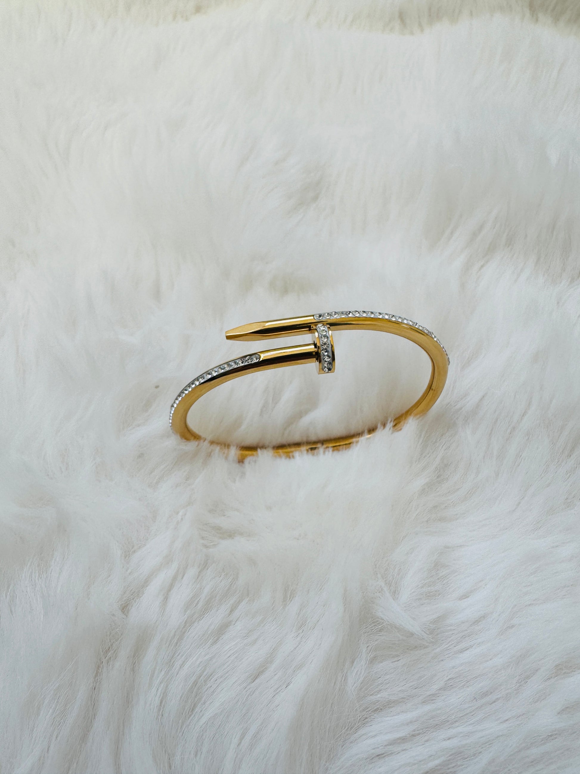 Make a bold statement with this Golden Nail Bangle, beautifully crafted in a sleek nail-inspired design and adorned with sparkling stones. The perfect blend of edgy and elegant, this bracelet shines with golden warmth and dazzling accents — a must-have for those who love a touch of luxury with attitude.Measurement: 6cmx5cm, Shape: Oval,silver plated,Anti Tarnish,waterproof and hypoallegenic